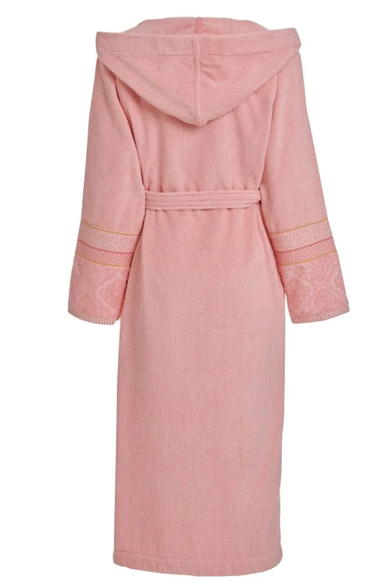 Deze Lange Roze Badjas Komt Uit De Soft Zellige Collectie Met Fijne Streepjes. De Mouwen Zijn Afgewerkt Met Roze En Gele Biesjes En Een Jacquard Motief. De Badjas Heeft Steekzakken En Een Capuchon. De Badjas Dient Voor Gebruik Gewassen Te Worden Volgens Het Care Label.