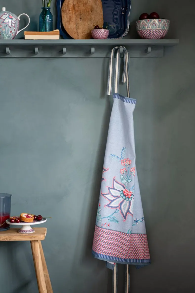 Vul Je Keukentextiel Aan Met Deze Flower Festival Keukenschort. Deze Keukenschort Heeft Een Blauwe Achtergrond En Is Versierd Met Het Elegante Flower Festival Dessin. Dit Rijke Bloemendessin Is Opgebouwd Uit Een Variatie Van Fantasierijke Rode En Roze Chintzbloemen Met Lichtblauwe En Groene Bladeren. De Speels Geplaatste Bloementakjes Met Uitgewerkte Gedecoreerde Bloemen En Bladeren Geven Dit Verfijnde Dessin Een Extra Rijke Beleving.