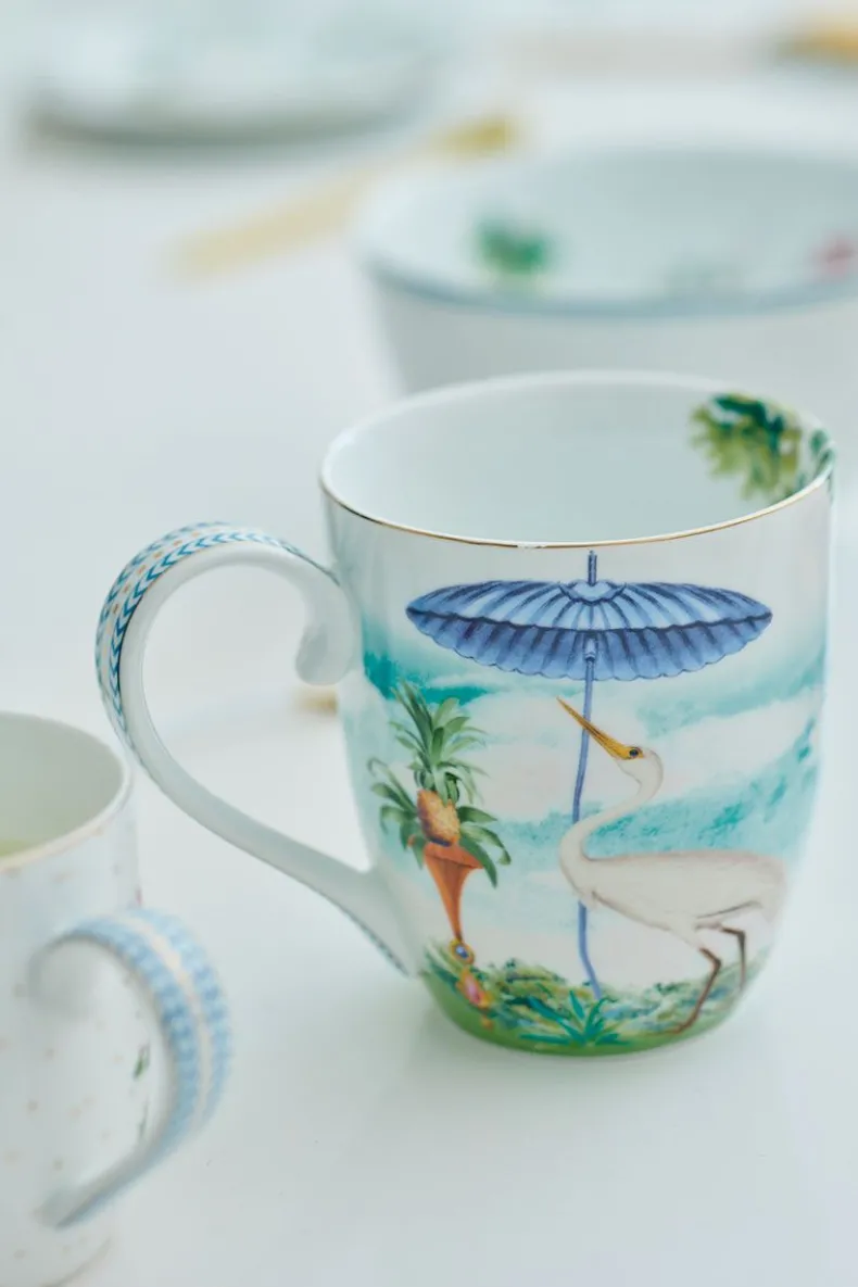 Deze Xl Mok Neemt Je Mee Op Reis Naar Een Tropisch Eiland Vanwege Zijn Versieringen. Met De Wolkerige Achtergrond En De Tropische Planten Waan Je Je In Een Wereld Vol Natuur. Een Vogel Vliegt Over Verschillende Planten, Bomen En Kleurrijke Bloemen. Het Handvat Van Deze Mok Is Versierd Met Blauwe Details.