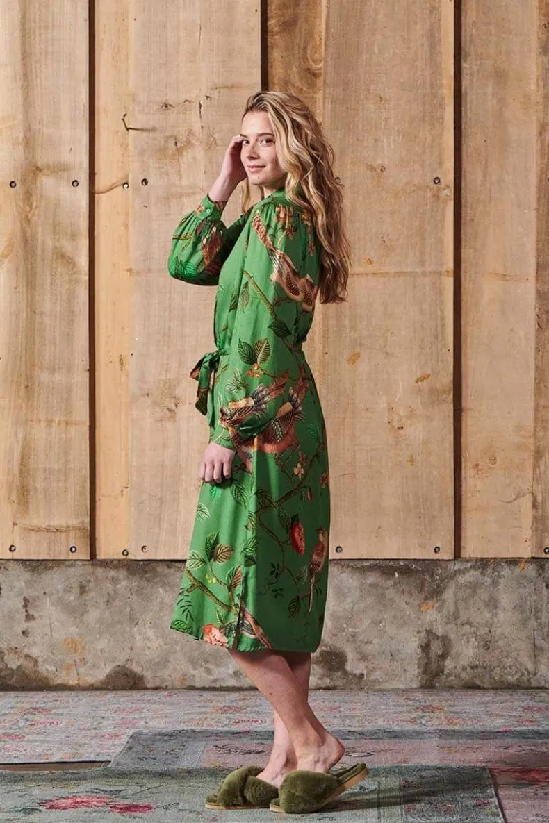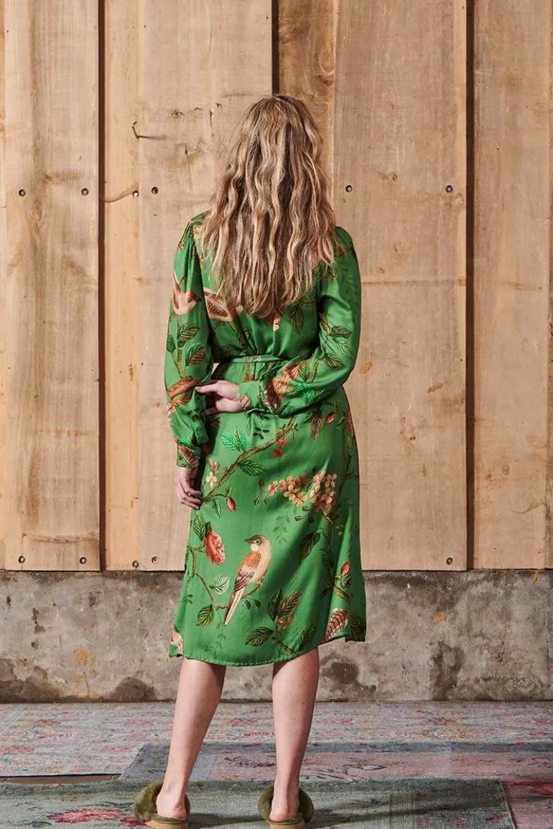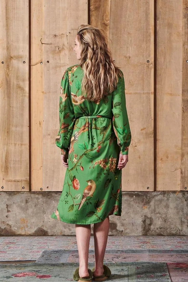 Deze Jurk In De Kleur Groen Is Uitgevoerd Met Het Rijke Good Nightingale Dessin. Het Herhaalde Bloemdessin Is Opgebouwd Uit Een Variatie Van Fantasierijke Chintz Bloemen En Vogels. Het Nachthemd Bevat Een V-Hals Kraag Hals Met Bijpassende Knopen.