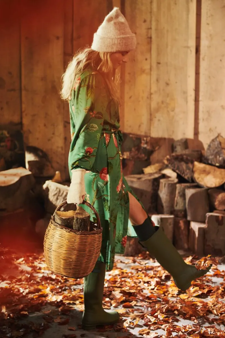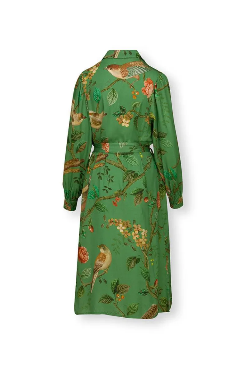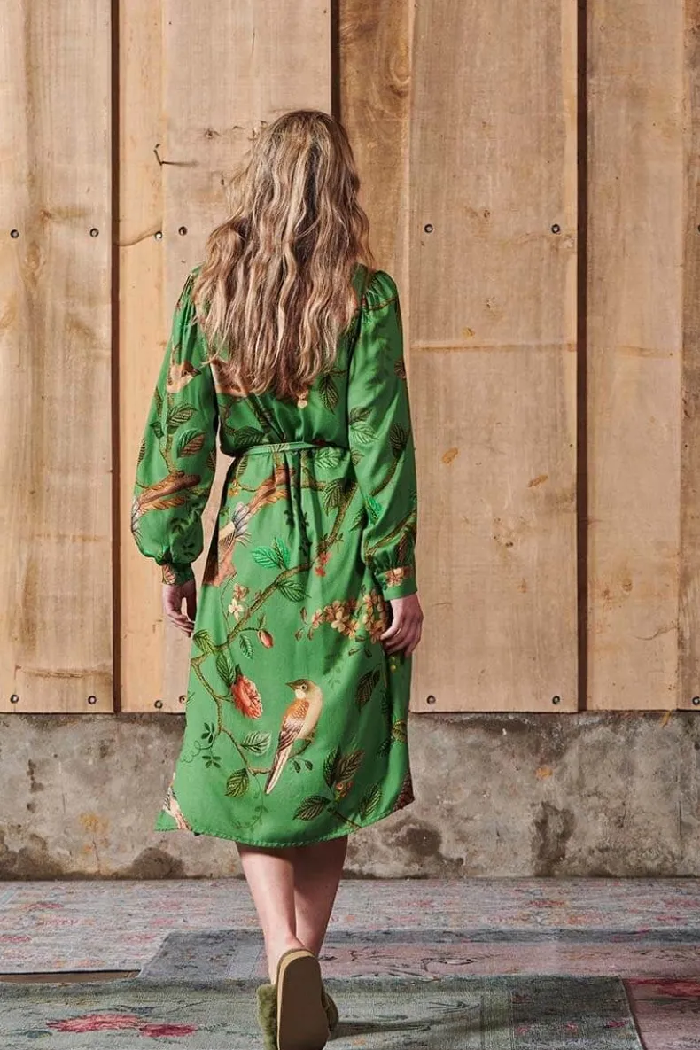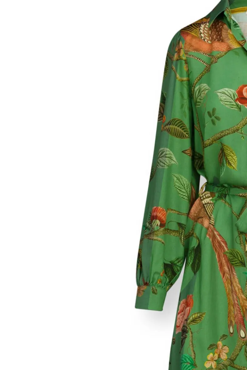 Deze Jurk In De Kleur Groen Is Uitgevoerd Met Het Rijke Good Nightingale Dessin. Het Herhaalde Bloemdessin Is Opgebouwd Uit Een Variatie Van Fantasierijke Chintz Bloemen En Vogels. Het Nachthemd Bevat Een V-Hals Kraag Hals Met Bijpassende Knopen.