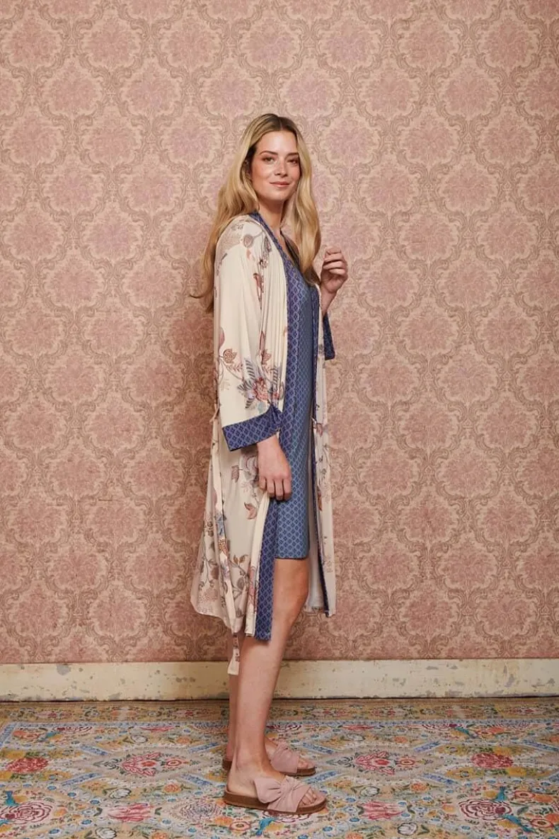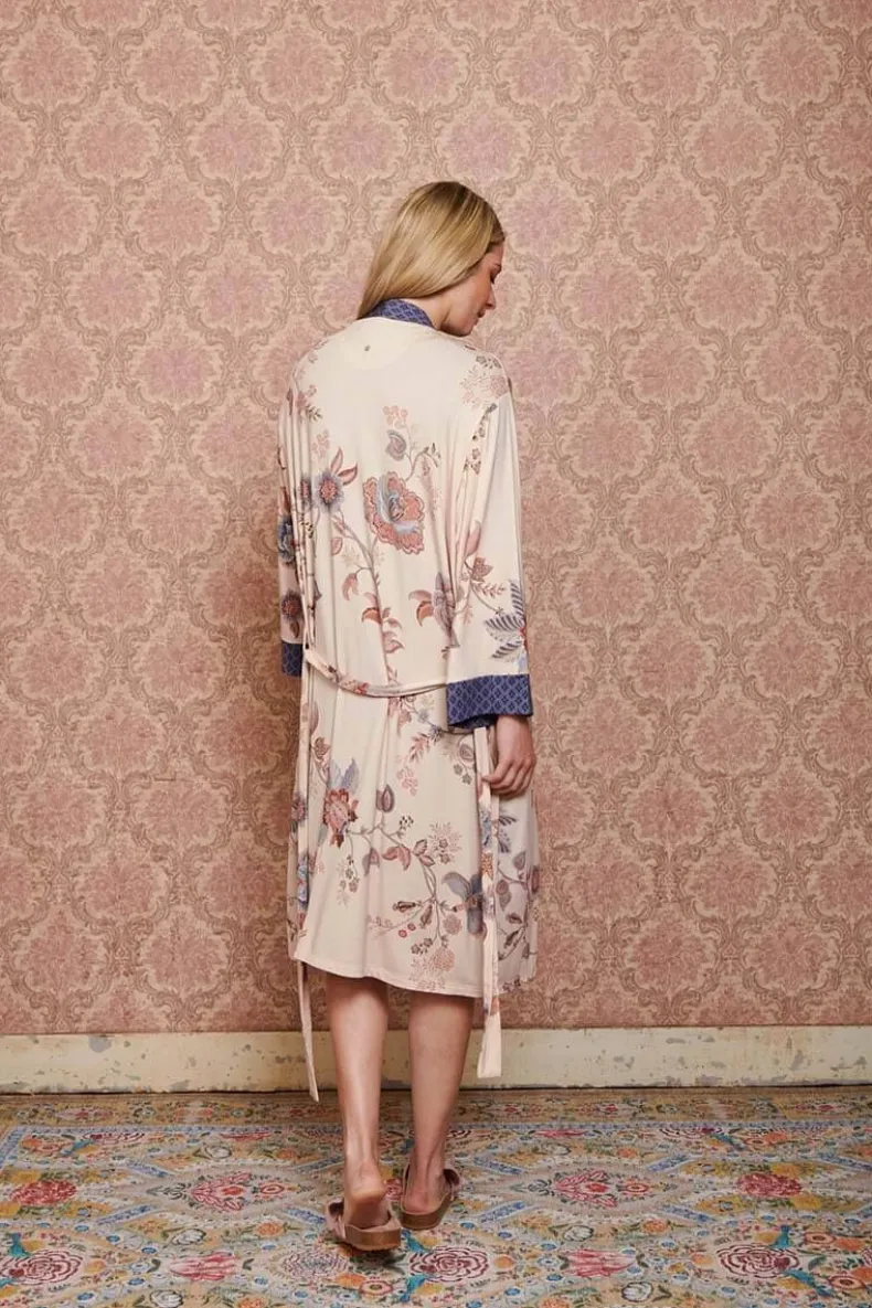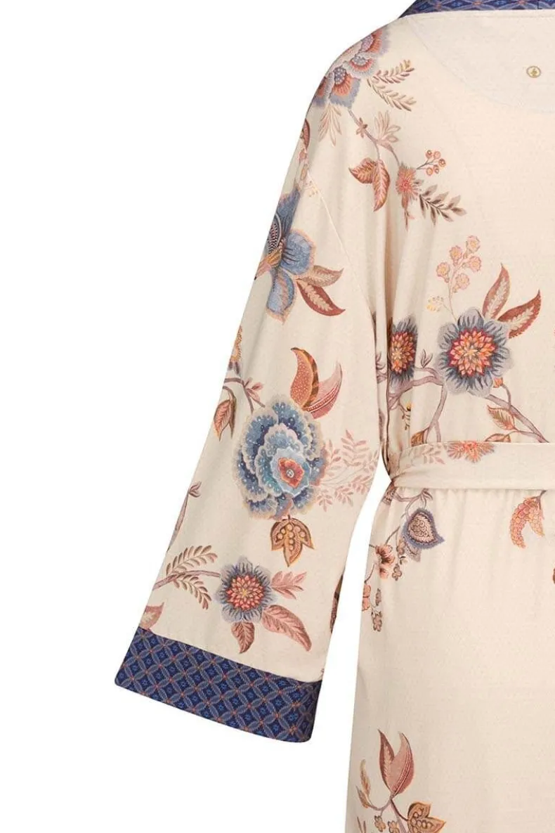 Deze Kimono Is Uitgevoerd Met Het Romantische Cece Fiore Dessin In Het Wit. Deze Kimono Heeft Een Prachtig Bloemendessin, Opgebouwd Uit Grote En Rijke Fanatasiebloemen. Over De Hele Print Zit Een Subtiel Patroon, Die De Print Nog Meer Diepte Geeft. De Kimono Bevat Een Bijpassend Ceintuur. De Biesjes Van De Kimono Zijn Bedrukt Met De Herhaalde Print Tegola, Wat Bestaat Uit Een Variatie Van Circels Met Een Speels Kleurverschil.