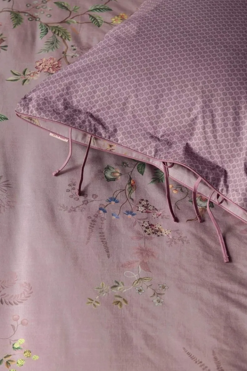 Het Autunno Kussensloop Heeft Een Dessin Van Elegante Bloemtakken Op Een Lila Ondergrond En Verticale Banden Met Aan Weerszijden Een Kleine Geometrische Print. Aan Elke Tak Groeien Verschillende Fantasiebloemen, Bessen En Bladeren En Hier En Daar Houdt Een Vogel Zich Schuil Tussen De Bladeren.