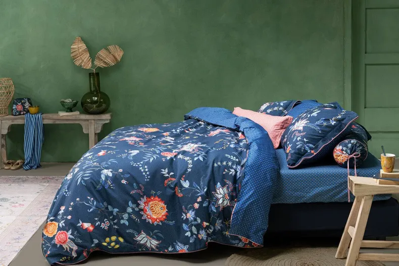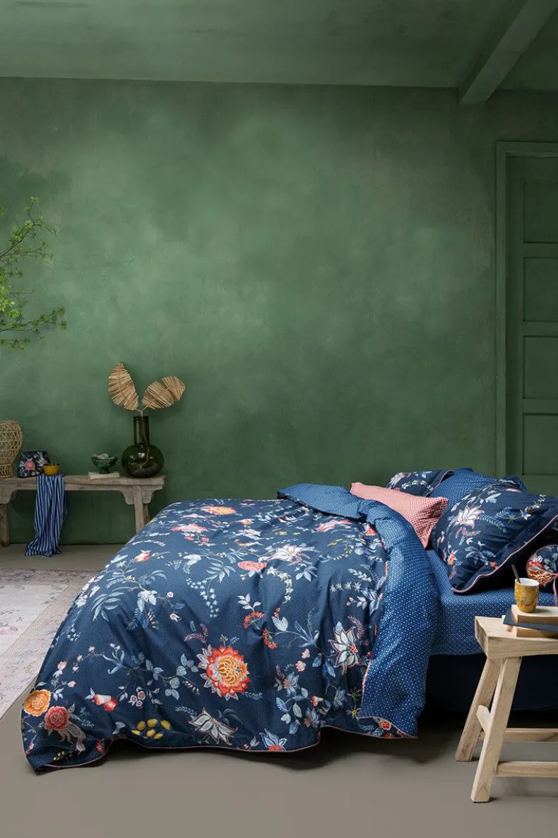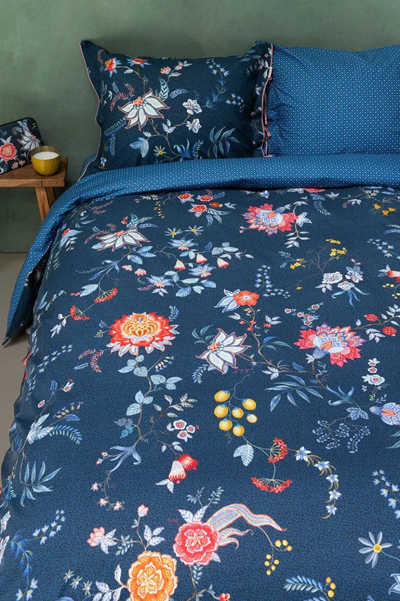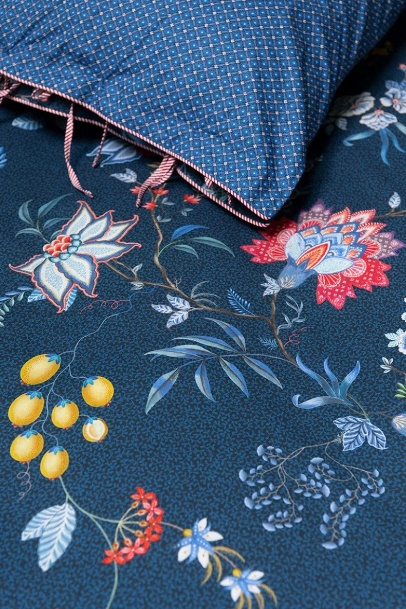 Het Donkerblauwe Kussensloop Flower Festival Bestaat Uit Een Rijk Bloemendessin, Opgebouwd Uit Een Variatie Van Fantasierijke Rode En Roze Chintzbloemen Met Lichtblauwe En Groene Bladeren. De Speels Geplaatste Bloementakjes Met Grote Uitgewerkte Gedecoreerde Bloemen En Bladeren Geven Dit Verfijnde Dessin Een Extra Rijke Beleving.