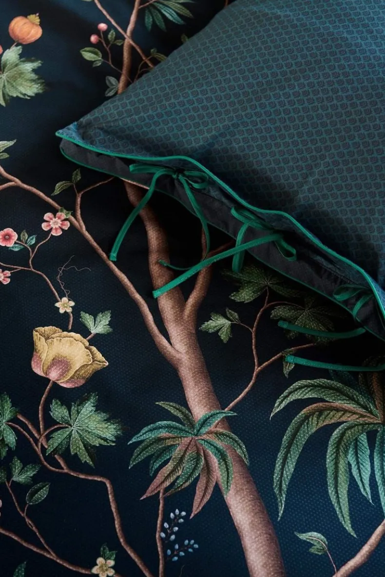 Het Il Paradiso Kussensloop Heeft Een Landschap Met Hoge Sierlijke Bomen, Waaraan Weelderige Bladeren En Fantasierijke Bloemen Groeien. Hier En Daar Houdt Een Vogel Zich Schuil Tussen De Bladeren.