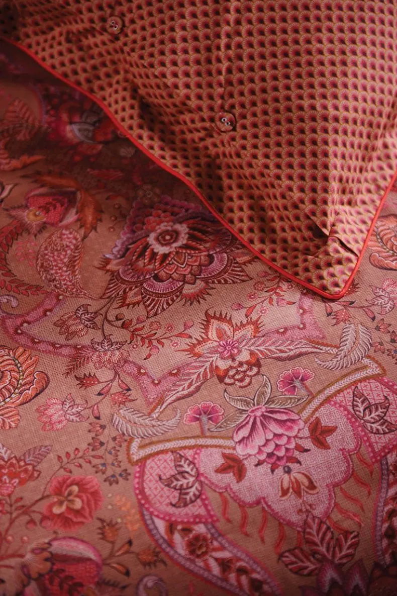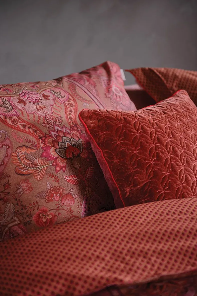 Dit Kussensloop In Roze Is Geprint Met Het Kyoto Nights Dessin. Deze Print Is Opgebouwd Uit Symmetrisch Geplaatste Bloemen En Ornamenten. Het Kussen Bevat Een Doorgestikte Rand, Knoopsluiting En Is Afgewerkt Met Een Fel Gekleurde Bies. De Achterkant Is Geprint Met Een Boogjes Dessin, Hierdoor Kan Het Kussen Dubbelzijdig Gebruikt Worden.