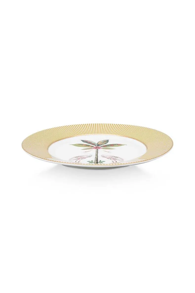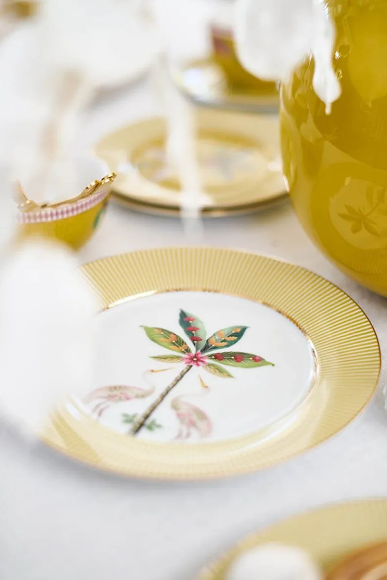 Vul Je Servies Aan Met Dit La Majorelle Ontbijtbord Van 21 Cm. Dit Gebaksbord Heeft Een Witte Achtergrond En Is Versierd Met Het Vrolijke La Majorelle Dessin. Dit Dessin Bestaat Uit Een Exotische Palmboom Waar Twee Reigers Omheen Zijn Gedecoreerd. De Rand Van Het Bord Is Versierd Met Geel Met Witte Strepen En Geven Het Bord Een Rijke Uitstraling. Met Ons La Majorelle Porselein Zul Je Jouw Servieskast En Tafel Laten Stralen!