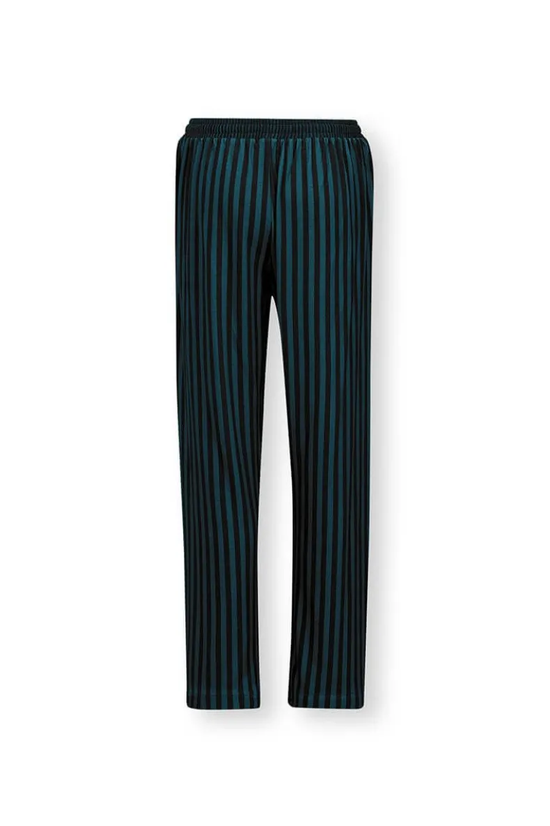 Deze Lange Broek In Het Donkerblauw Is Uitgevoerd Met Het Gestreepte Sumo Stripe Dessin. Het Herhaalde Dessin Is Opgebouwd Uit Symmetrische Strepen. De Taille Is Elastisch En Heeft Een Koord Rondom Voor Een Comfortabele Fit.