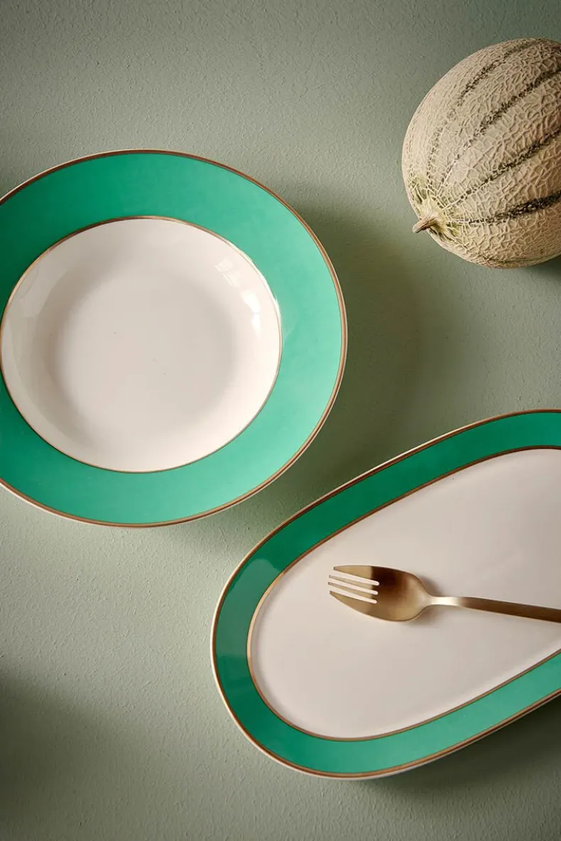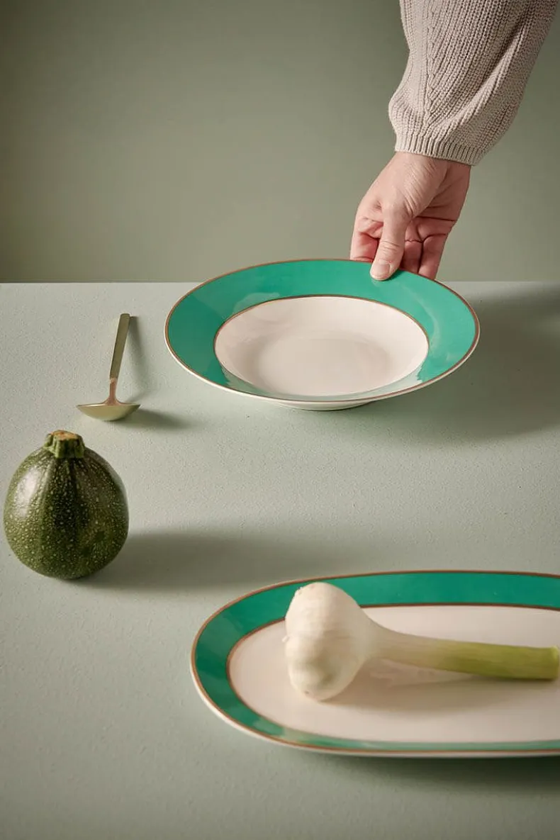 Dit Diepe Bord Heeft Een Groene Rand Met Een Witte Achtergrond In Het Midden. Het Bord Is Afgewerkt Met Gouden Details En Perfect Om Te Combineren Met De Andere Borden Uit Deze Collectie. Het Porselein Is Gemaakt Van Bone China, Een Hoogwaardig Dun Porselein Met Een Verfijnd Design. Ook Verkrijgbaar In De Maten: 17 Cm, 23 Cm En 28 Cm. Bekijk De Volledige Pip Chique Collectie Voor Meer Inspiratie.