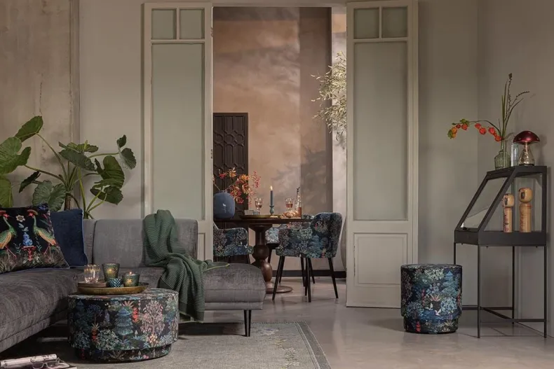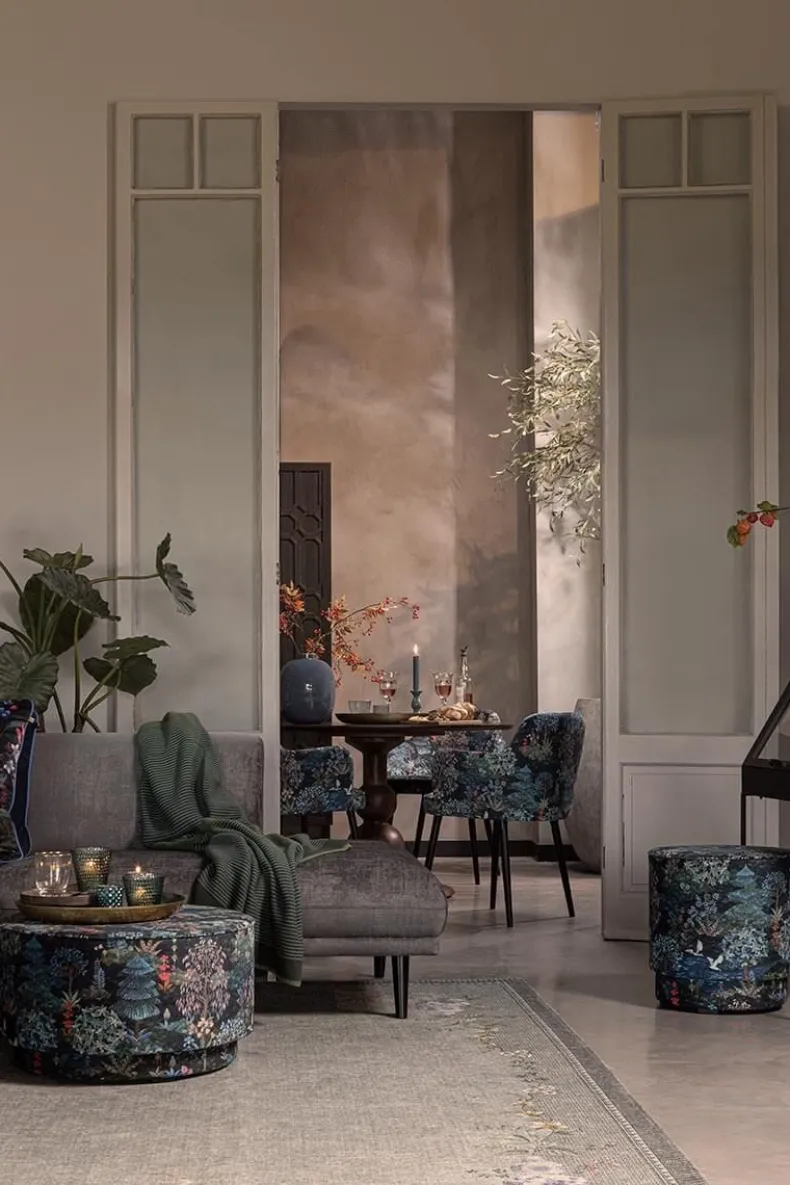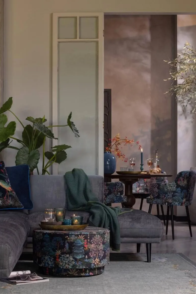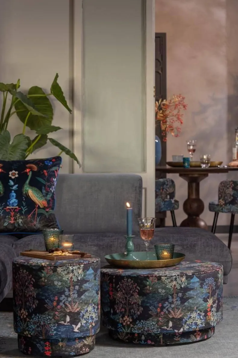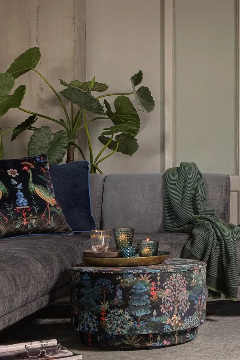 De Large Donkerblauwe Pip Garden Poef Heeft Een Sprookjesachtige Uitstraling. Het Dessin Bestaat Uit Een Variatie Van Fantasierijke Bomen En Kleurrijke Bloemen Gecombineerd Met Prachtige Vogels. Combineer De Poef Met Het Matchende Donkerblauwe Pip Garden Vloerkleed En Maak Er Een Magische Plek Van. De Poef Kun Je Gebruiken Als Zitje Of Om Je Benen Op Te Laten Rusten.