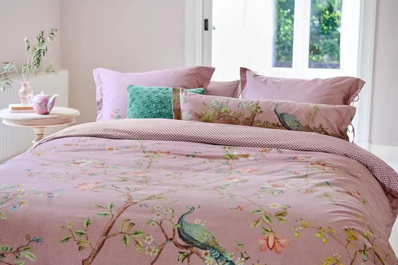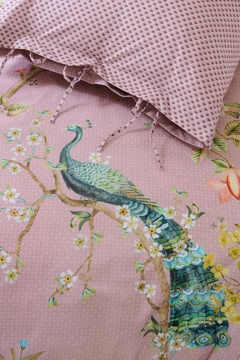 Het Romantische Lila Okinawa Sierkussen Is Geinspireerd Op Oosterse Chinoiserie-Prints. Sierlijke Pauwen Staan Parmantig Liefdevol In Een Landschap Van Japanse Bloesembomen En Orientaalse Fruitboompjes. Aan De Takken Groeien Prachtige Bloemen, Exotisch Fruit En Kleine Sierbessen. De Achterkant Heeft Een Patroon Van Kleine Boogjes. Dit Geeft Het Okinawa Kussen Tezamen Met De Striksluiting Een Rijke Uitstraling. Het Kussen Kun Je Tweezijdig Gebruiken, Zo Creeer Je Een Speels Mix & Match Effect.