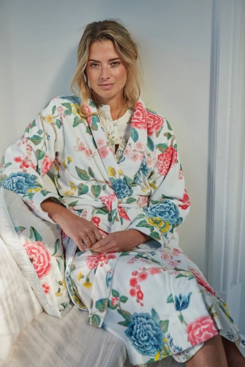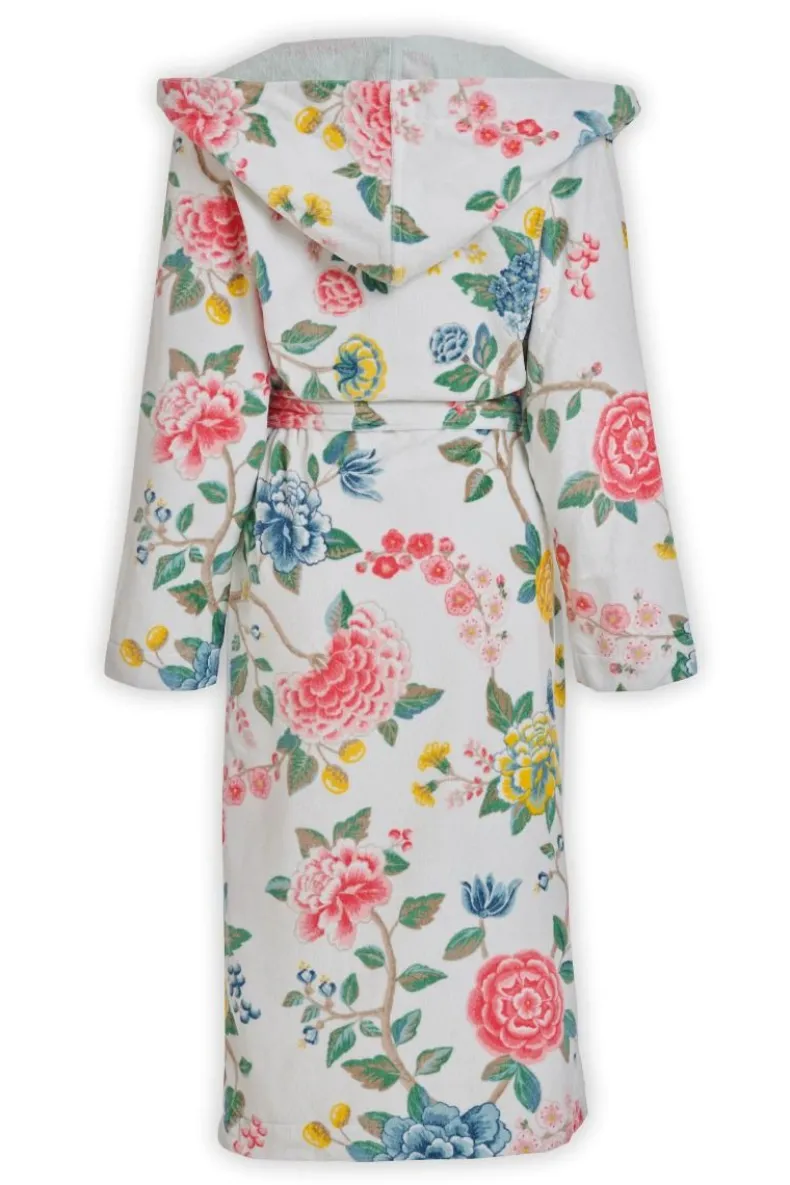 Deze Zachte Witte Badjas Is Versierd Met Het Good Evening Dessin Vol Kleurrijke Bloemen. De Badjas Heeft Steekzakken En Een Capuchon. De Badjas Dient Voor Gebruik Gewassen Te Worden Volgens Het Care Label.