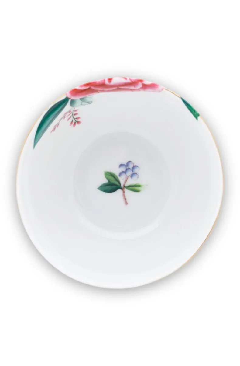 Deze Kleine Kom Is Versierd Met Exotische Bloemen, Een Vlinder En Gouden Details. De Achtergrond Is Versierd Met Een Verfijnde Print. De Grote Roze Bloem Valt Sierlijk Over De Rand Heen En Binnenin De Kom Komen Elementen Uit Het Dessin Terug. Vormt Een Mooie Combinatie Met De Rest Van Het Servies Uit De Blushing Birds Collectie.