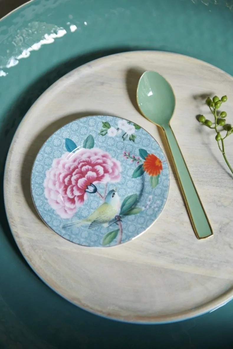 Dit Blauwe Petit Four Bord Is Versierd Met Exotische Bloemen En Een Vogel Uit De Blushing Birds Collectie. De Achtergrond Heeft Een Verfijnd Dessin.