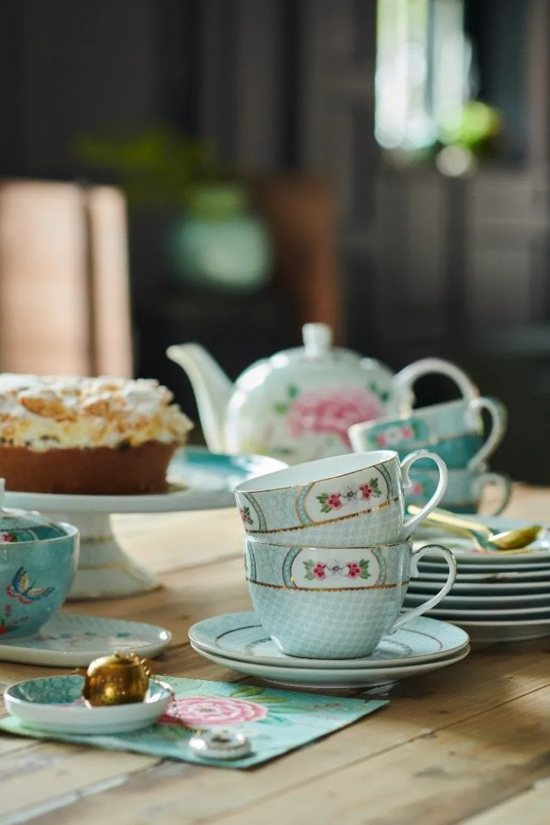 Deze Cappuccino Kop En Schotel Zijn Versierd Met Een Lichtblauw Dessin, Exotische Bloemen En Gouden Details. Vormt Een Mooie Combinatie Met De Rest Van Het Koffieservies Uit De Blushing Birds Collectie.