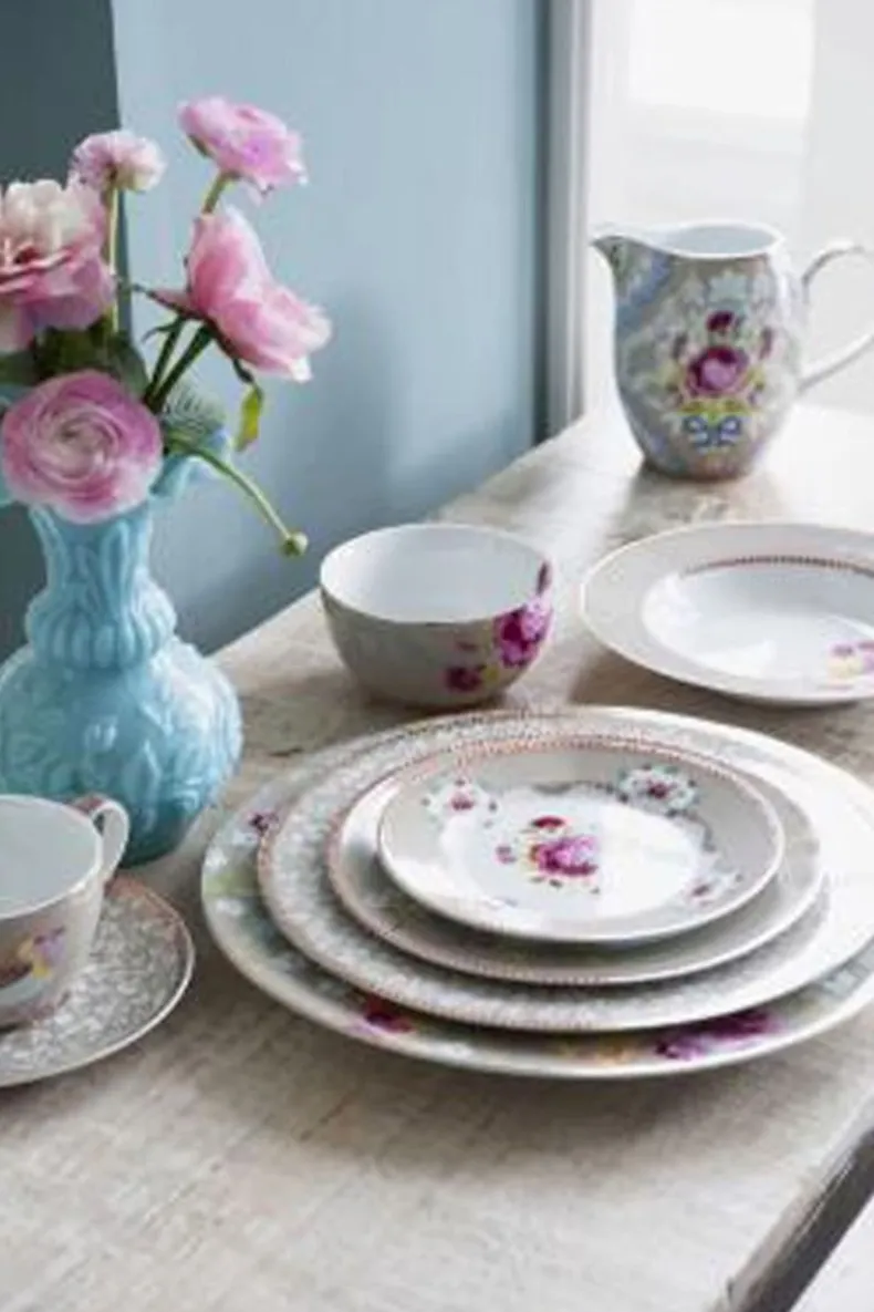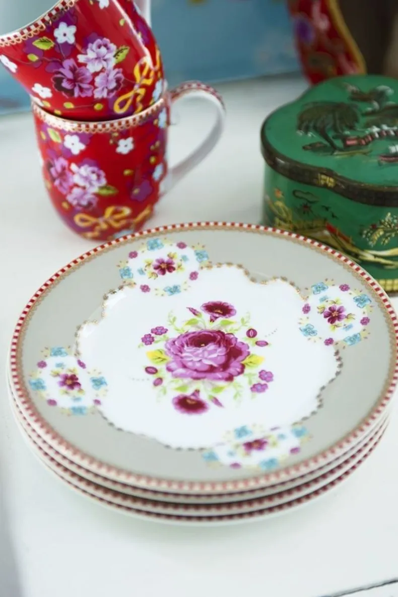 Het Gebaksbordje Met Het Shabby Chic Dessin Maakt Deel Uit Van Het Floral Servies. Het Bord Is Voorzien Van Gouden Details.