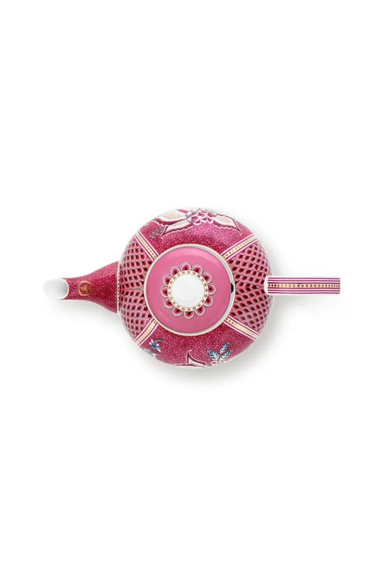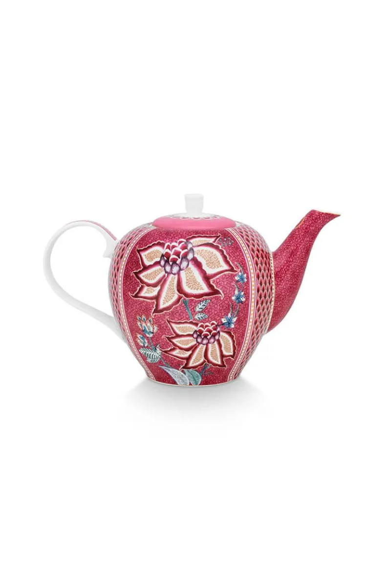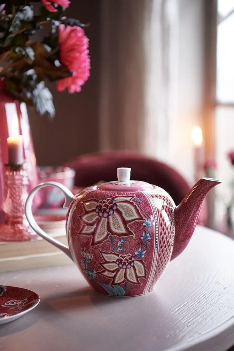 Geniet Extra Lang Van Je Thee Met Deze Theepot Uit De Flower Festival Collectie. De Theepot Heeft Een Bloemendessin Met Fantasierijke Rode En Roze Chintzbloemen Met Lichtblauwe En Groene Bladeren.
