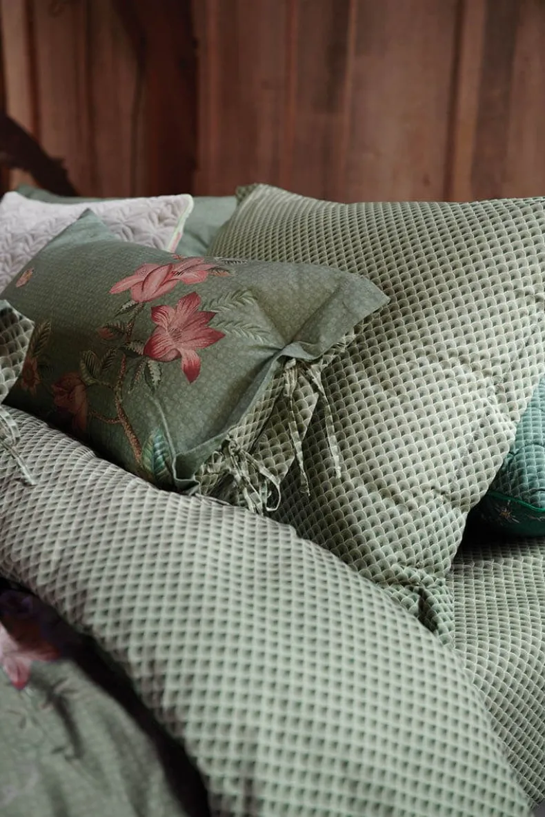 Dit Olijf Groene Hoeslaken Is Geprint Met Het Organische Suki Dessin. De Print Is Een All-Over Print Van Gestileerd Boogjes Met Verfijnde Details.