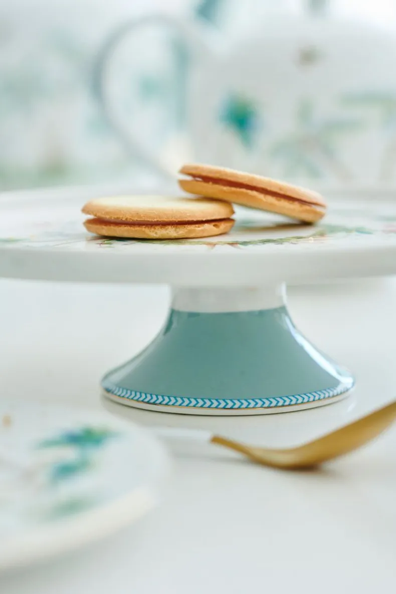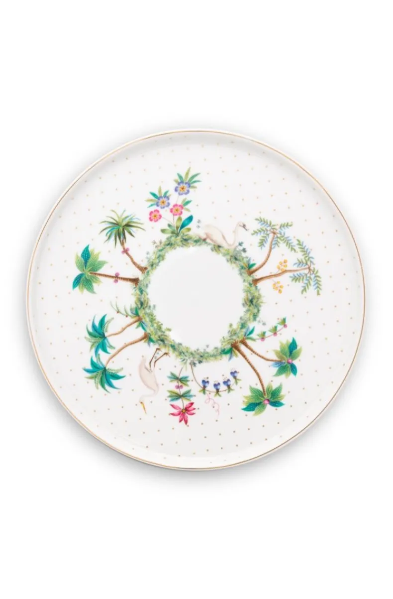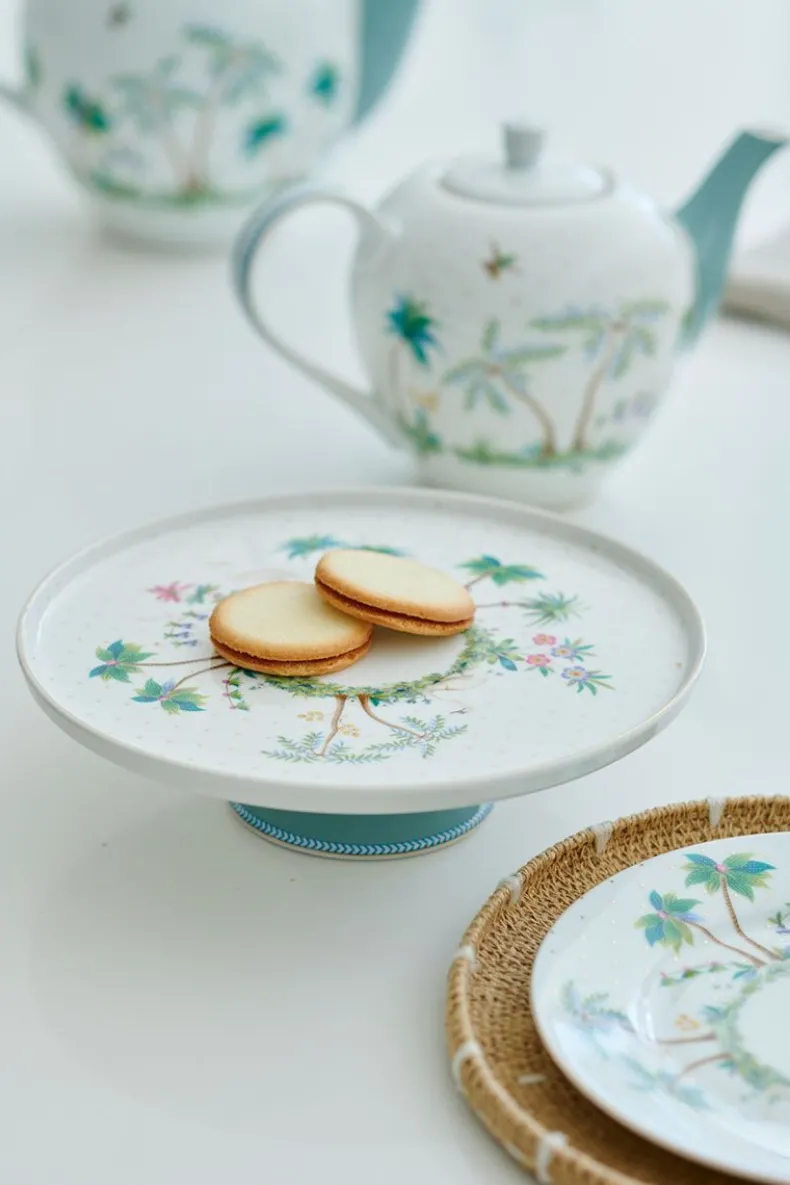 Gebruik Deze Taartplateau Bij Een High Tea Met Vrienden Om Een Heerlijke Taart Te Laten Zien. De Bodem Van Deze Taartplateau Is Blauw, Wat De Schaal Een Elegante Uitstraling Geeft. Het Bord Van Dit Dienblad Heeft Een Witte Achtergrond Met Gouden Stippen. Bovendien Geeft De Taartplateau Je Het Gevoel Van Een Tropisch Eiland Door Zijn Design. In Het Midden Vind Je Verschillende Planten, Bloemen En Prachtige Palmbomen.