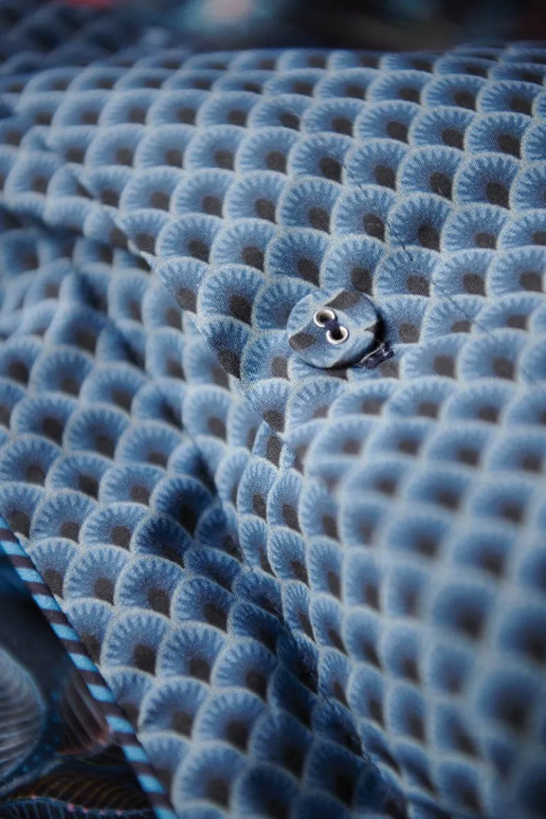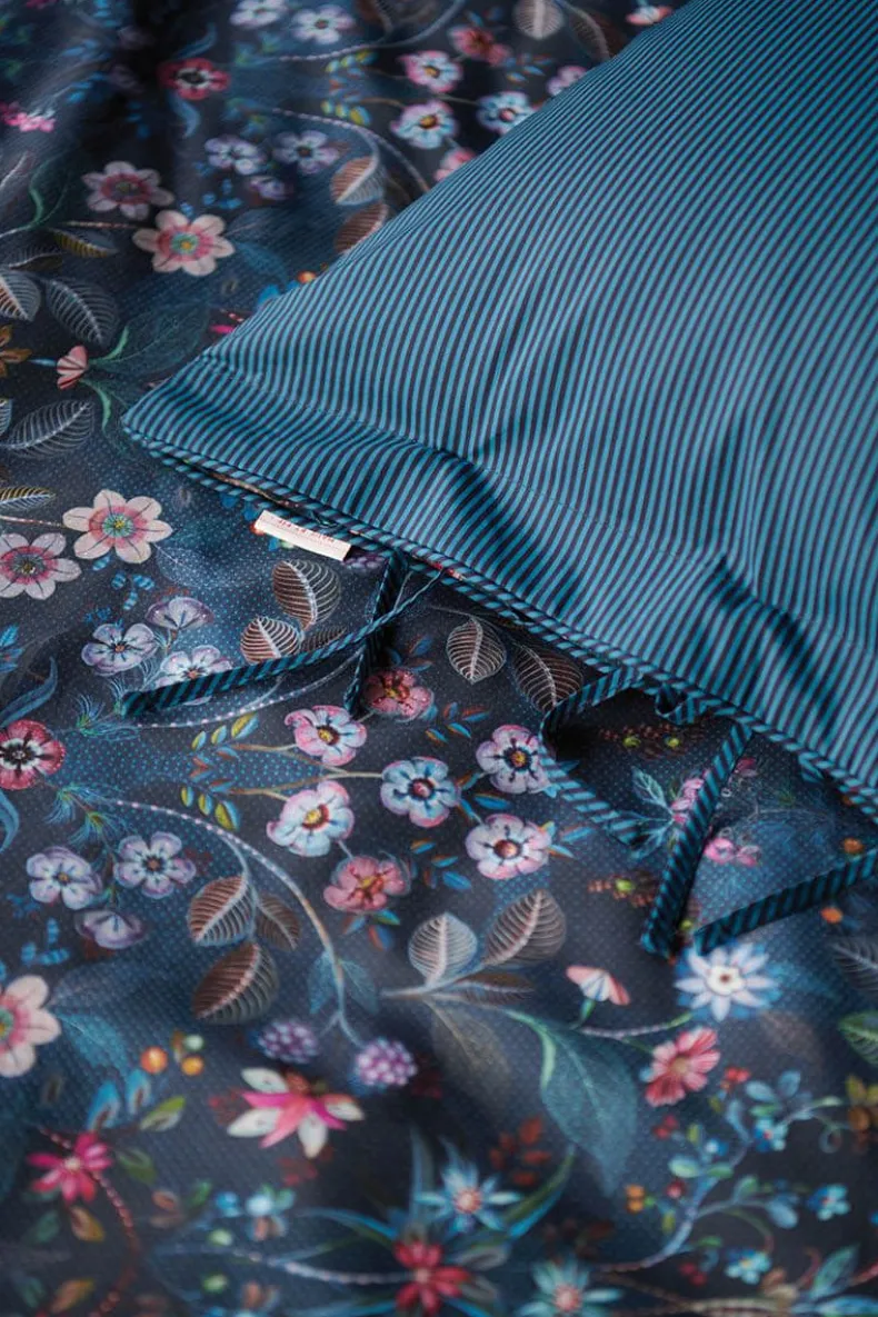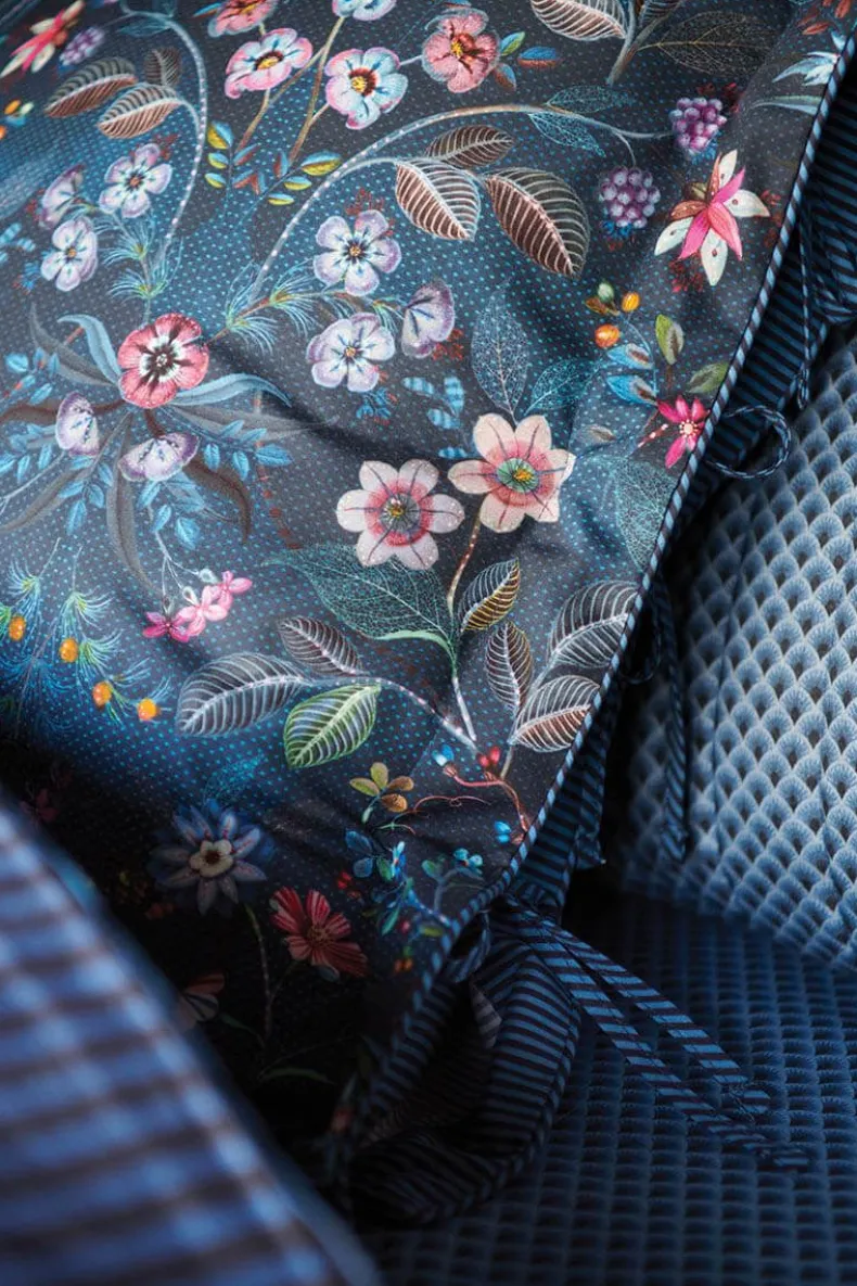 Dit Kussensloop In Donkerblauw Is Geprint Met Het Mirrorama Dessin. Het Kussensloop Is Versierd Met Verschillende Herfst Ornamenten En Gestileerde Takken En Bladeren. Het Kussen Bevat Een Doorgestikte Rand, Striksluiting En Is Afgewerkt Met Een Gestreepte Bies. De Achterkant Is Geprint Met Een Streepdessin, Hierdoor Kan Het Kussen Dubbelzijdig Gebruikt Worden.
