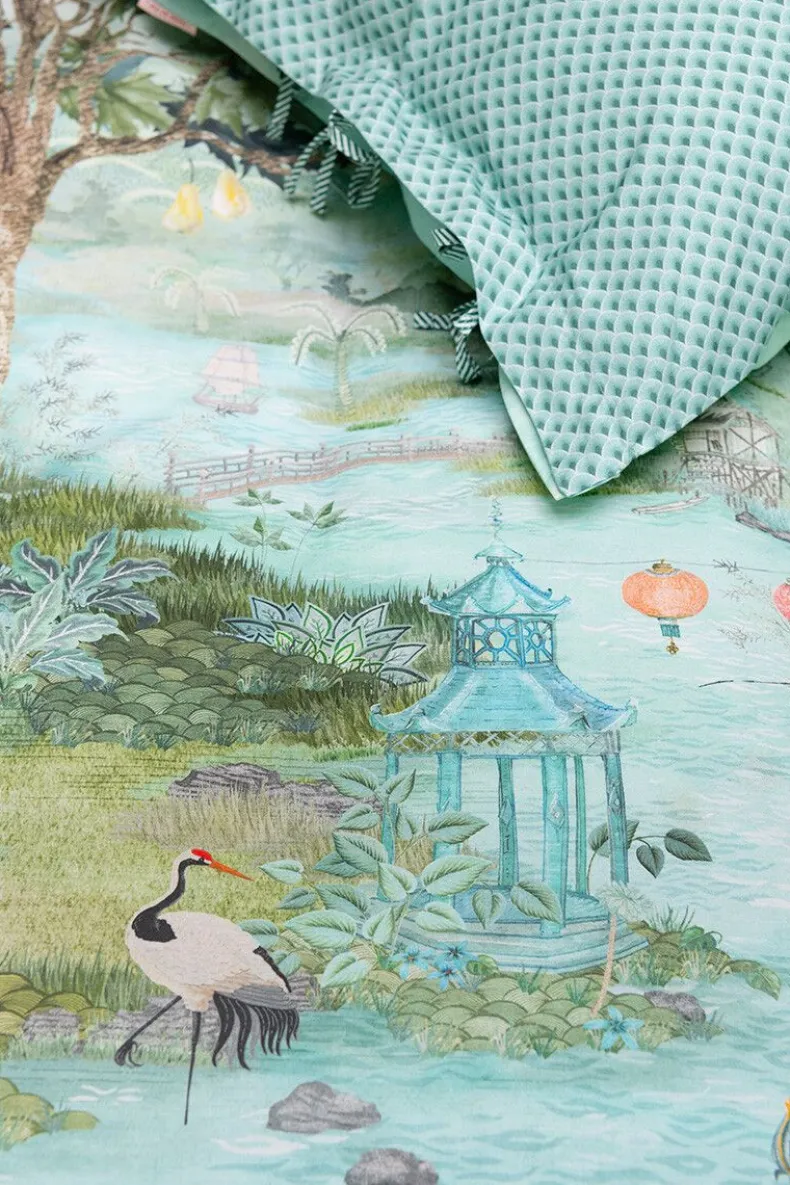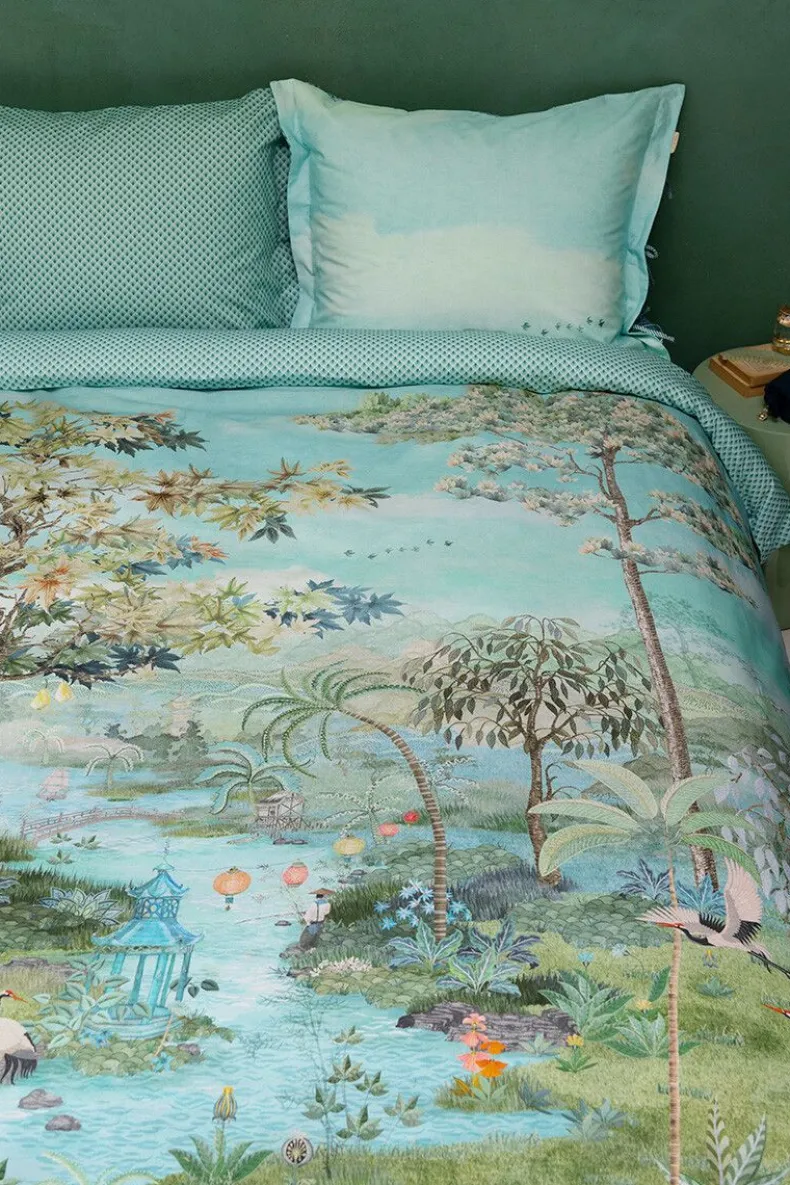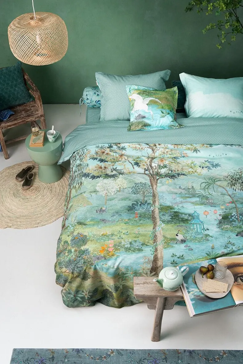 Het Groene Kussensloop Pip Paradise Is Geinspireerd Op De Glooiende Landschappen Die Je In Japan Kunt Vinden. Op Het Dessin Is Een Zachtgroene Lucht Te Zien Waar Een Paar Exotische Vogels Vliegen. De Zachte Kleuren Geven De Kussensloop Een Exotische Maar Rustige Sfeer.