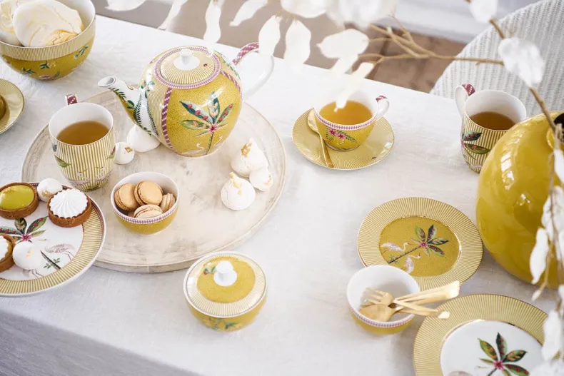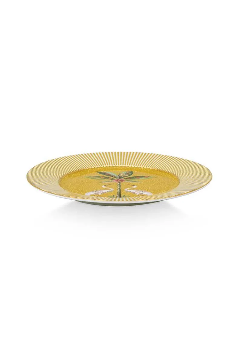 Vul Je Servies Aan Met Dit La Majorelle Gebaksbord Van 17 Cm. Dit Gebaksbord Heeft Een Gele Achtergrond En Is Versierd Met Het Vrolijke La Majorelle Dessin. Dit Dessin Bestaat Uit Een Exotische Palmboom Waar Twee Reigers Omheen Zijn Gedecoreerd. De Rand Van Het Bord Is Versierd Met Gele En Met Witte Strepen En Geven Het Bord Een Rijke Uitstraling. Met Ons La Majorelle Porselein Zul Je Jouw Servieskast En Tafel Laten Stralen!