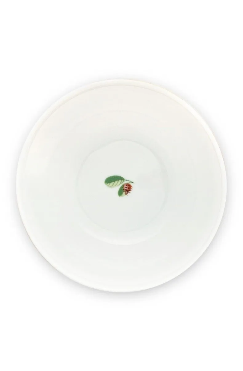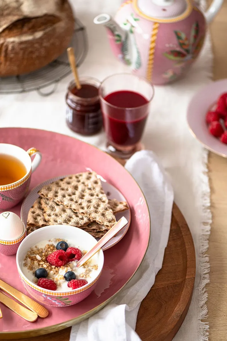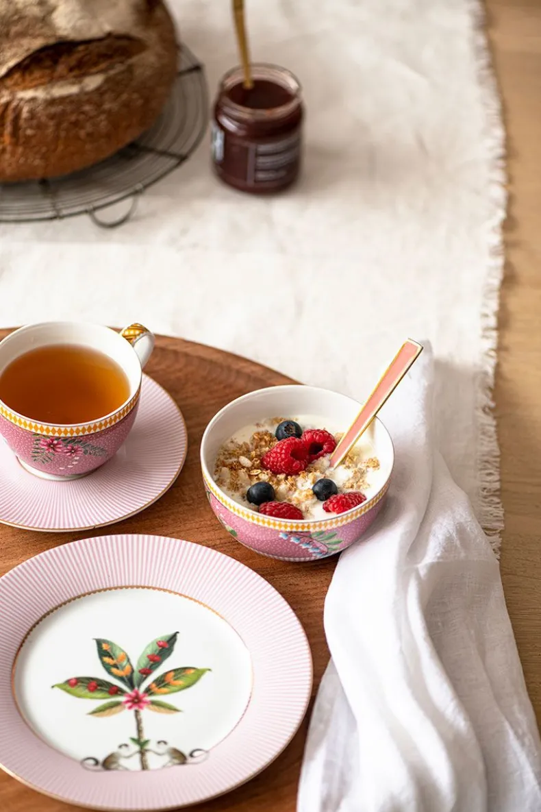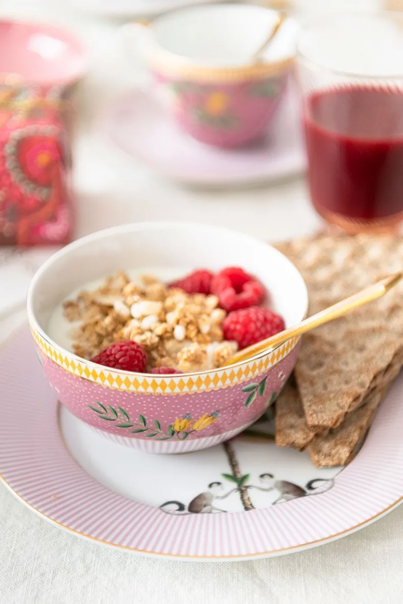 Deze Roze Kom Is Rondom Versierd Met Exotische Bloemen Op Een Roze Achtergrond. De Onderste Helft Is Versierd Met Een Roze-Wit Gestreept Dessin.