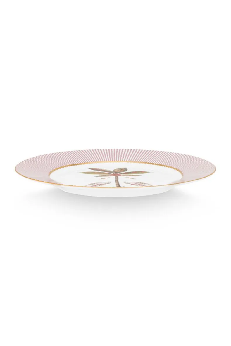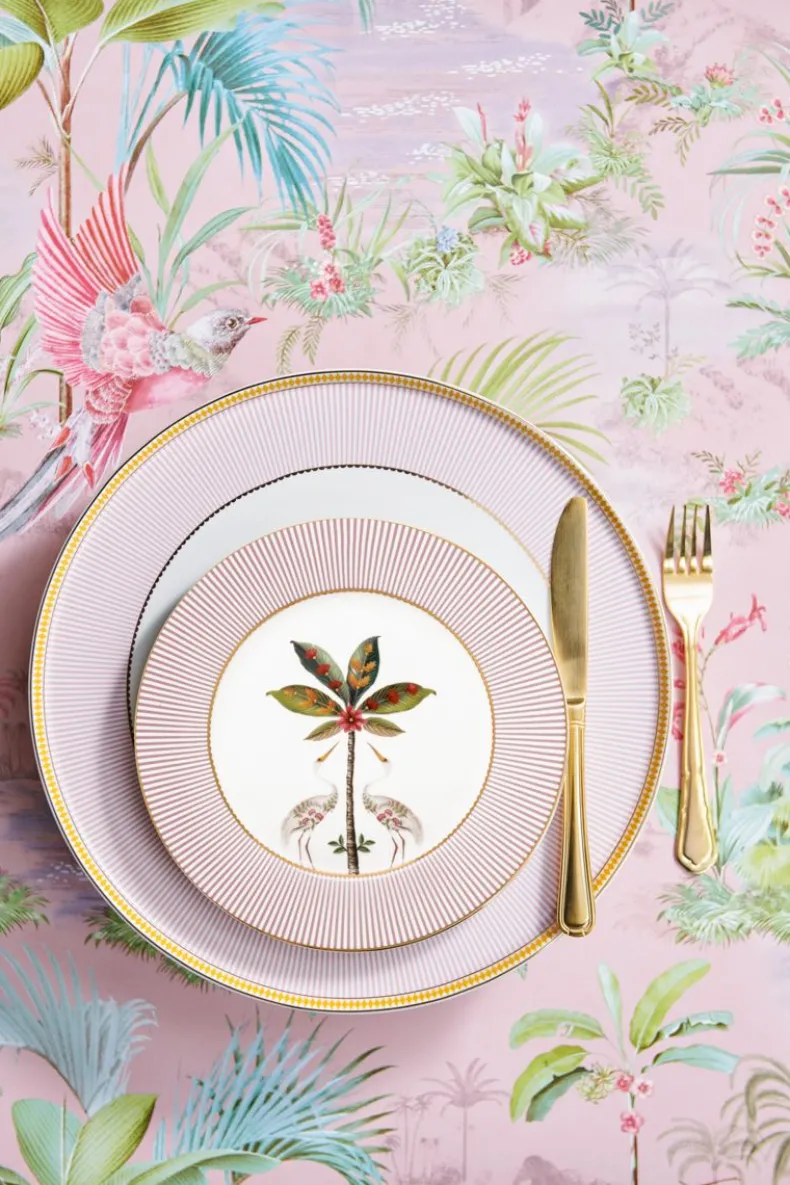 Vul Je Servies Aan Met Dit La Majorelle Ontbijtbord Van 21 Cm. Dit Gebaksbord Heeft Een Witte Achtergrond En Is Versierd Met Het Vrolijke La Majorelle Dessin. Dit Dessin Bestaat Uit Een Exotische Palmboom Waar Twee Reigers Omheen Zijn Gedecoreerd. De Rand Van Het Bord Is Versierd Met Roze Met Witte Strepen En Geven Het Bord Een Rijke Uitstraling. Met Ons La Majorelle Porselein Zul Je Jouw Servieskast En Tafel Laten Stralen!