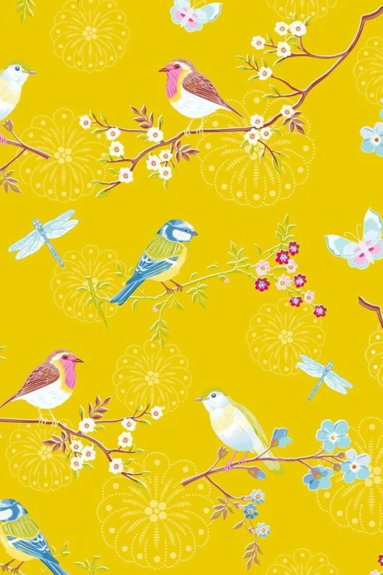 Breng Een Stukje Nostalgie In De Kamer Met Dit Early Bird Behang. Dit Gele Behang Is Voorzien Van Een Herhalend Artwork Met Centraal Daarin Het Roodborstje Op Een Chinese Bloesemtak.
