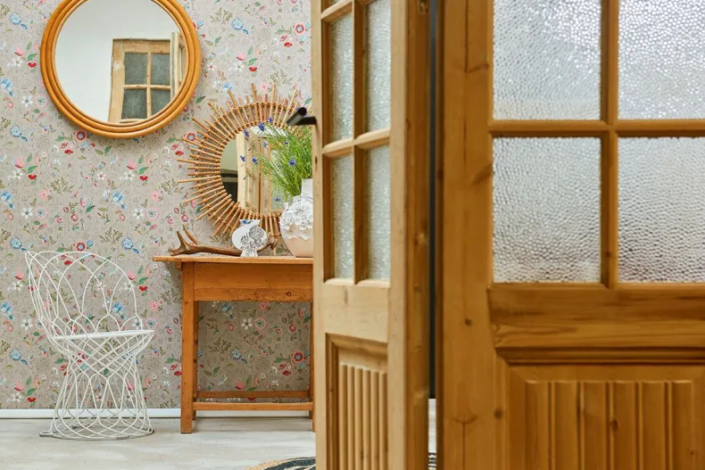 Dit Kaki Behang Met Levendig Spring To Life Patroon Transformeert Elke Kamer In Het Huis Tot Een Stijlvolle Ruimte. De Combinatie Van Bloemen, Planten En Vogels Creeert Een Verhalend Karakter En Een Unieke Sfeer.