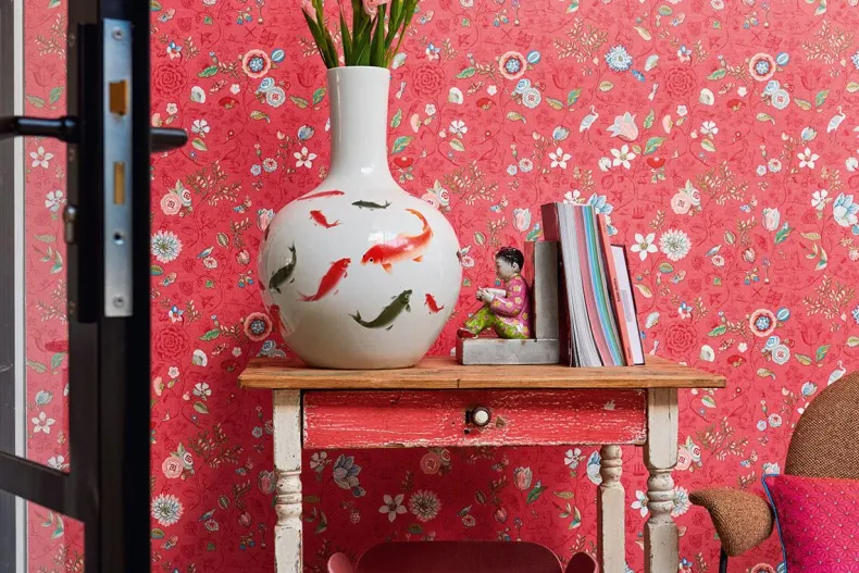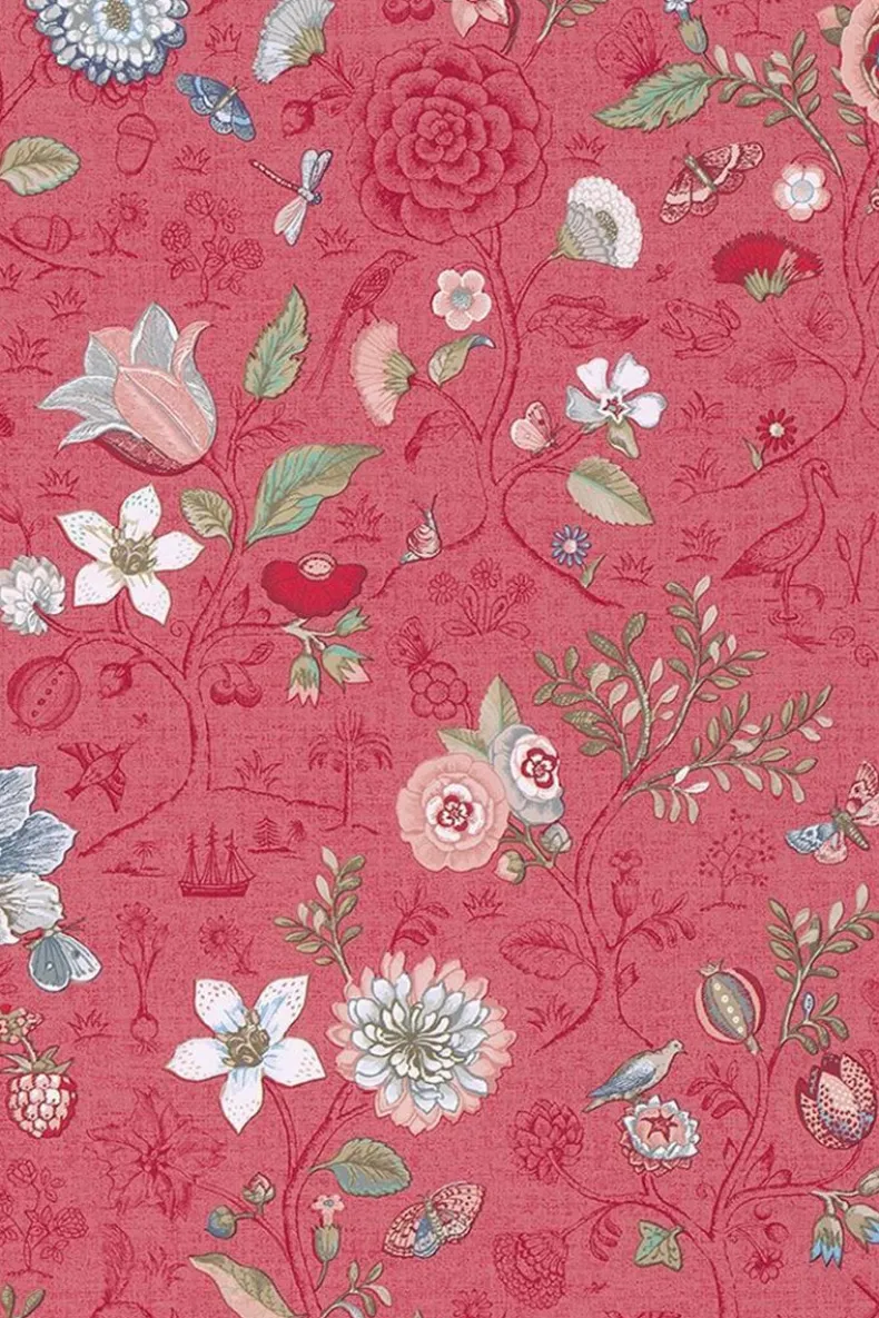 Dit Roze Behang Met Levendig Spring To Life Patroon Transformeert Elke Kamer In Het Huis Tot Een Stijlvolle Ruimte. De Combinatie Van Bloemen, Planten En Vogels Creeert Een Verhalend Karakter En Een Unieke Sfeer.