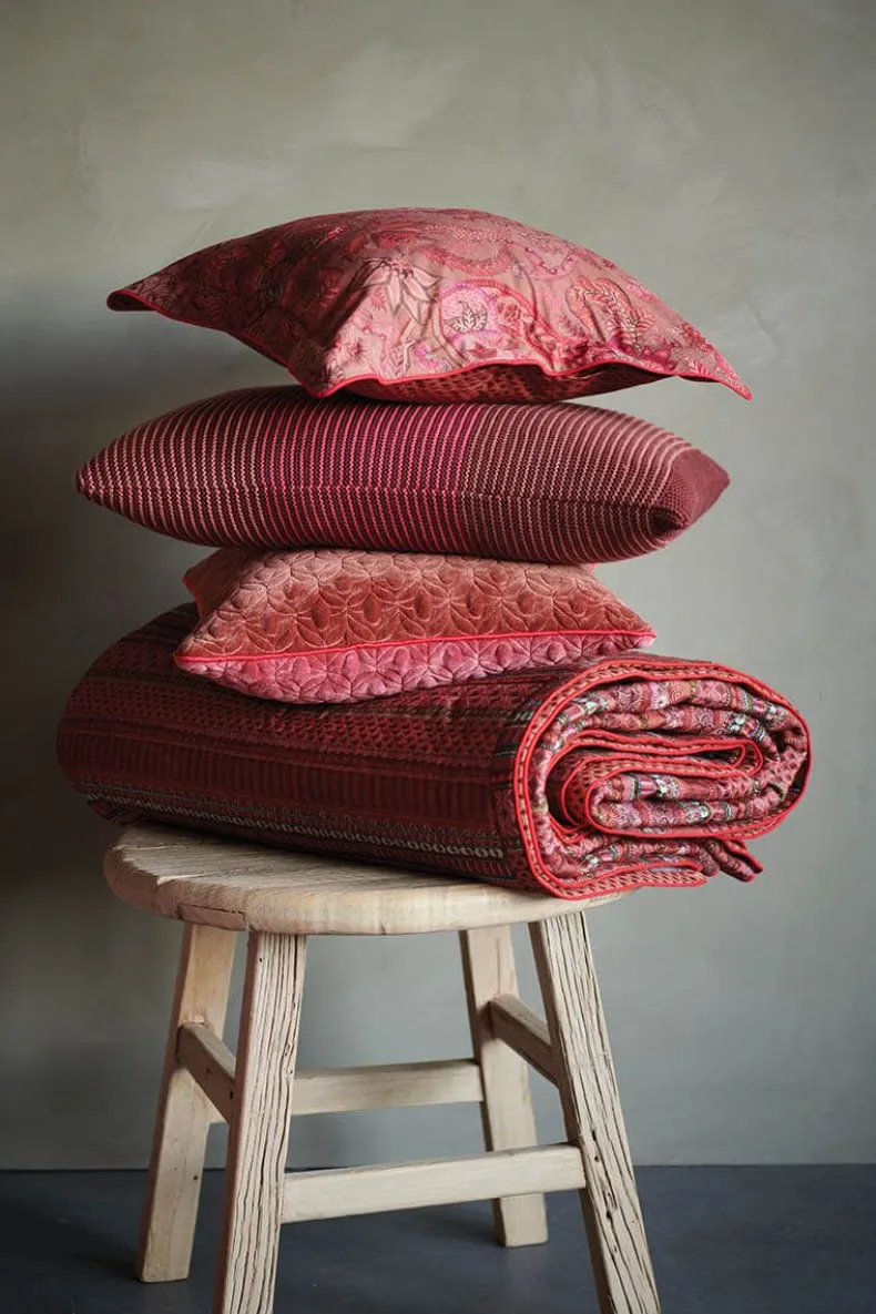Deze Rode Quilt Is Gedecoreerd Met Het Gestreepte Ribbon Dessin. Deze Print Is Opgebouwd Uit Een Herhaald Patroon Aan De Voorkant Van Gestilleerde Strepen, Boogjes En Ruiten.