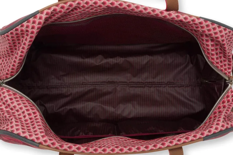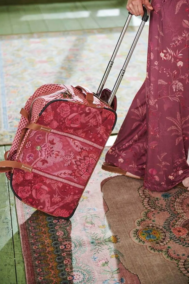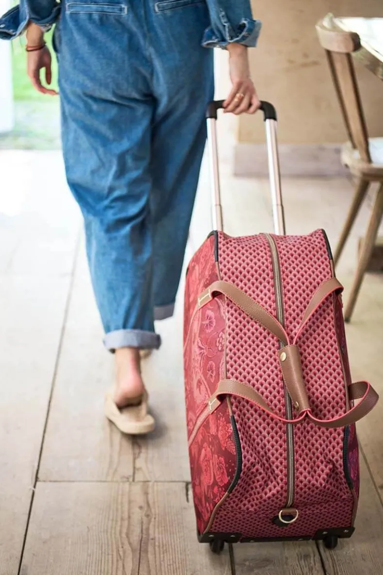 De Nieuwe Weekender Op Wielen In De Kleur Donkerroze Met Het Kyoto Fesitval Dessin Is Een Geweldige Aanvulling Voor Je Warderobe. Deze Weekender Heeft Een Groot Opbergvak Voor Je Kleding En Schoenen, Waarin 3 Zijvakjes Te Vinden Zijn. Een Met Rits En Twee Met Elastische Band. De Tas Is Waterafstotend Van Binnen En Buiten, Dus Perfect Voor Elke Weersvoorspelling. Hiernaast Kan Je Van De Weekender, Een Weekender Op Wielen Van Maken Door De Hendel Uit Het Opbergvak Te Halen.