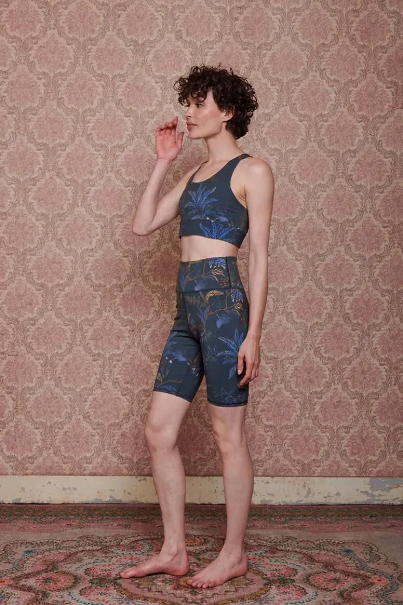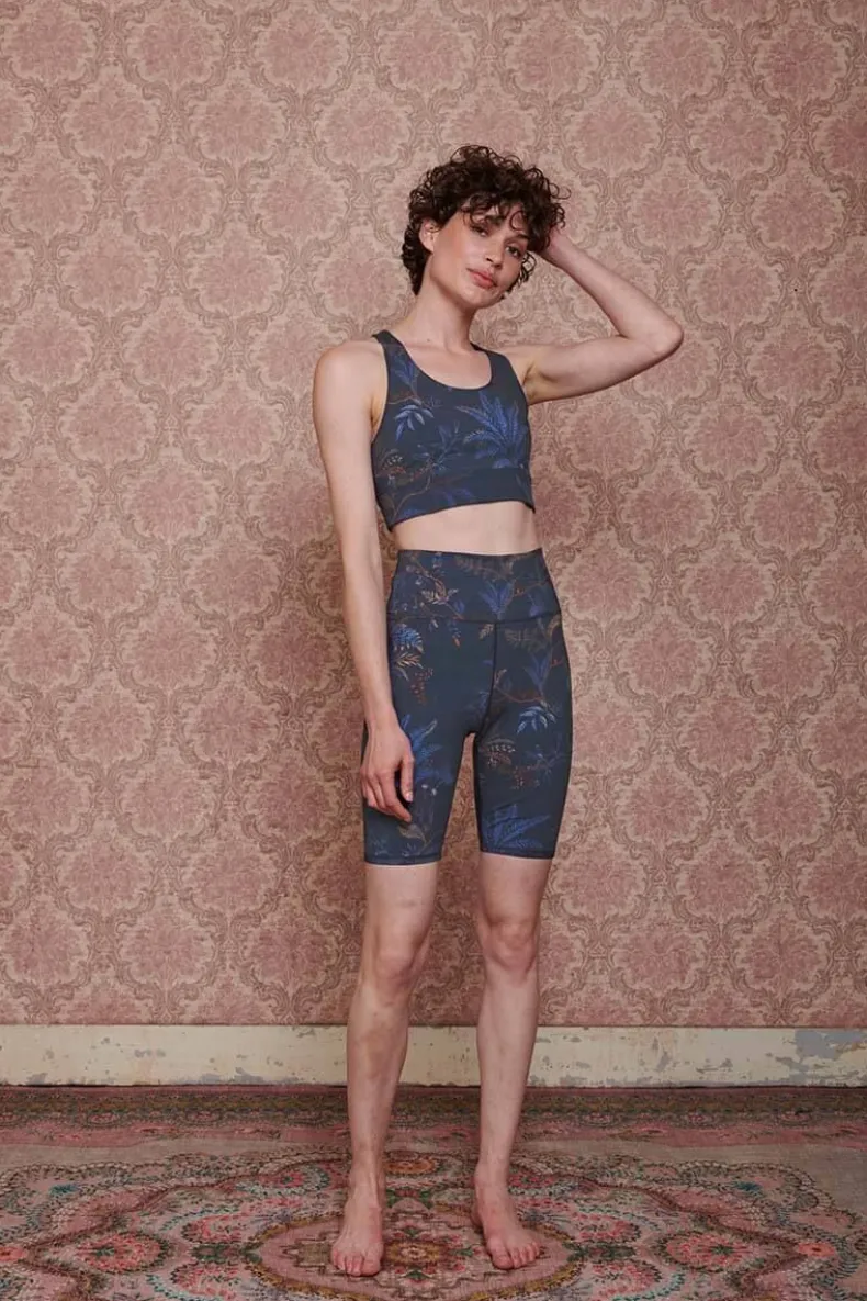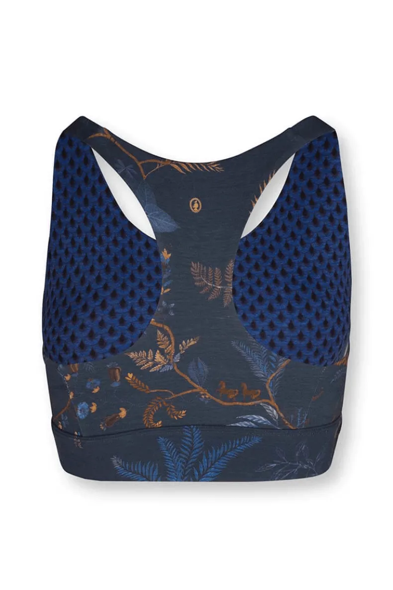 Deze Sport Bh In De Kleur Donkerblauw Is Uitgevoerd Met Het Speelse Isola Dessin. De Print Is Opgebouwd Uit Een Verfijnde Print Van Meerkleurige Takjes En Varens. De Binnenkant Is Bedrukt Met Het Suki Dessin.