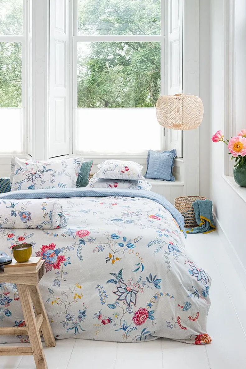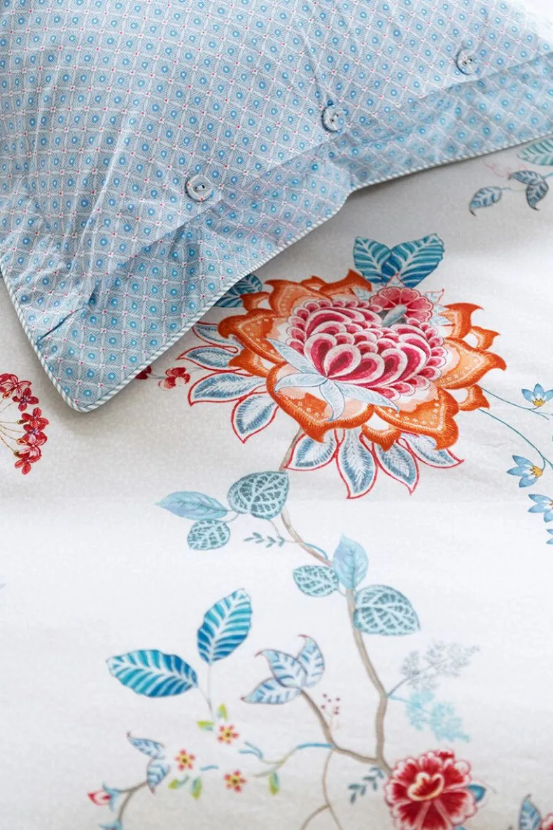 Het Vrolijke Witte Sierkussen Flower Festival Is Opgebouwd Uit Een Variatie Van Fantasierijke Rode En Roze Chintzbloemen Met Lichtblauwe En Groene Bladeren. De Speels Geplaatste Bloementakken Met Grote Gedecoreerde Bloemen En Bladeren Geven Dit Verfijnde Dessin Een Extra Rijke Beleving. De Achterkant Heeft Een Gestileerde Geometrisch Print.