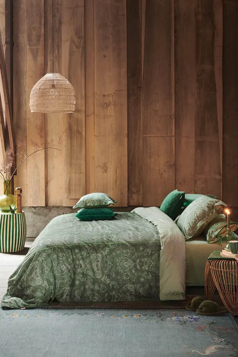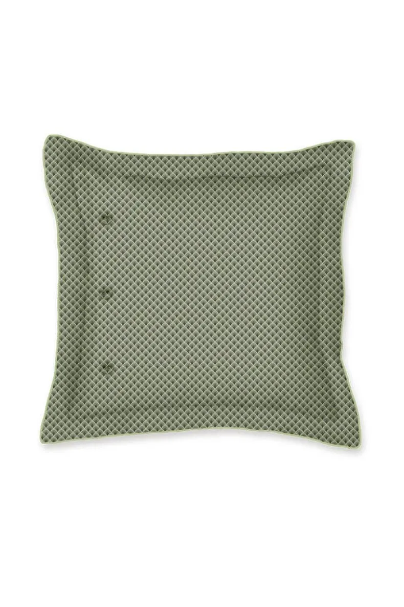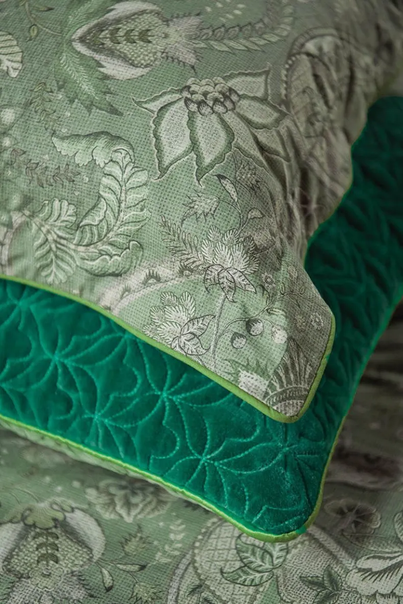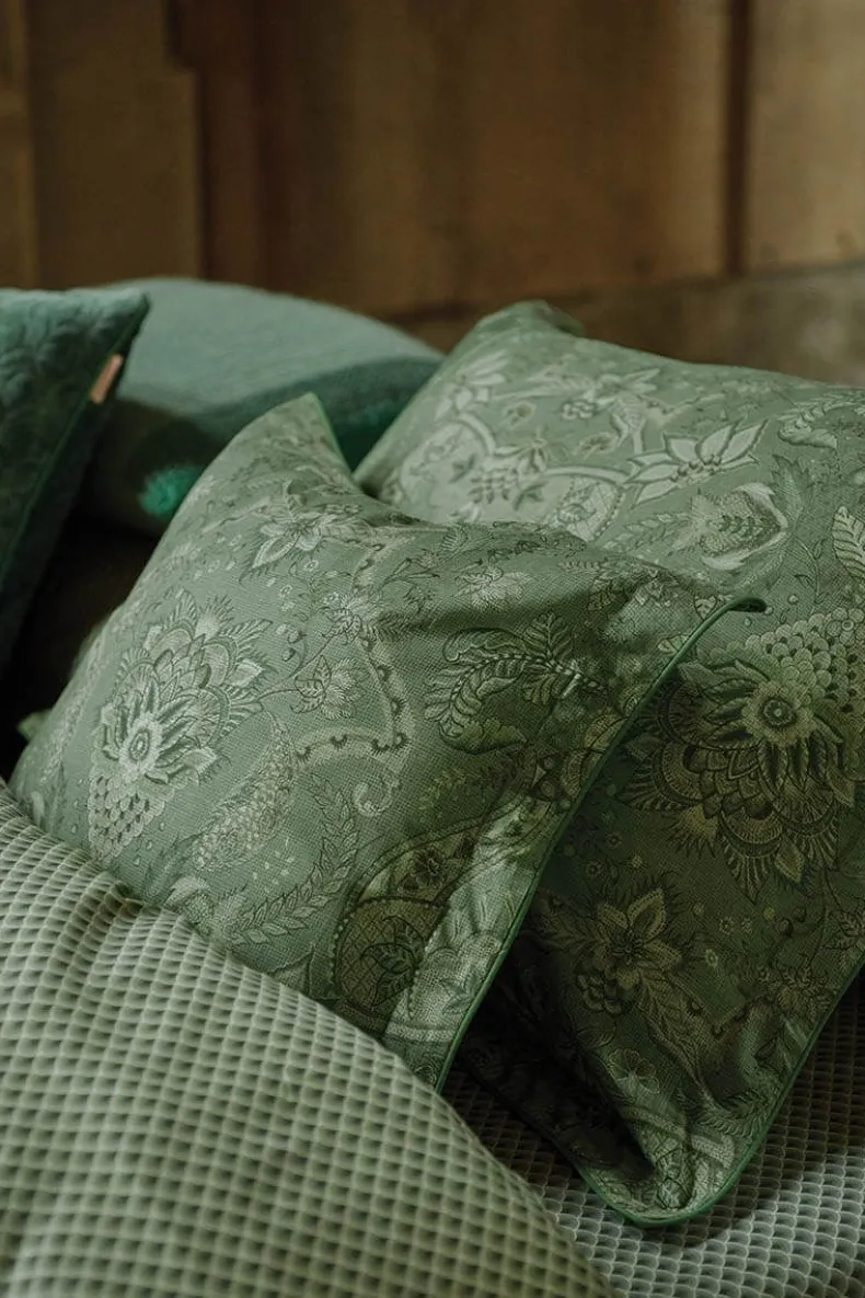 Dit Vierkante, Groene Kussen Is Versierd Met Het Kyoto Nights Dessin. Deze Print Is Opgebouwd Uit Symmetrisch Geplaatste Bloemen En Ornamenten. Het Sierkussen Heeft Een Oxford Rand Aan De Zijkanten En Een Patroon Van Gestileerde Boogjes Aan De Achterkant. Het Sierkussen Is Afgewerkt Met Een Gestofeerde Knoopsluiting En Kan Dubbelzijdig Gebruikt Worden.